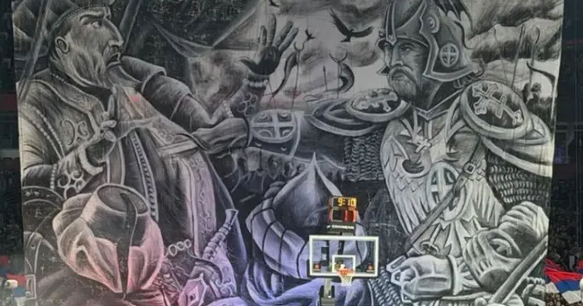 Цялата трибуна зад един от кошовете бе покрита с изображение от Косовската битка.