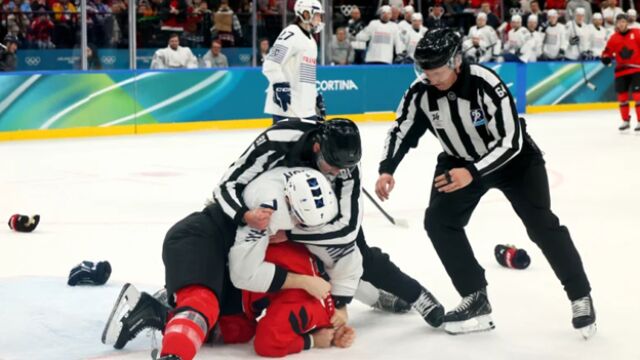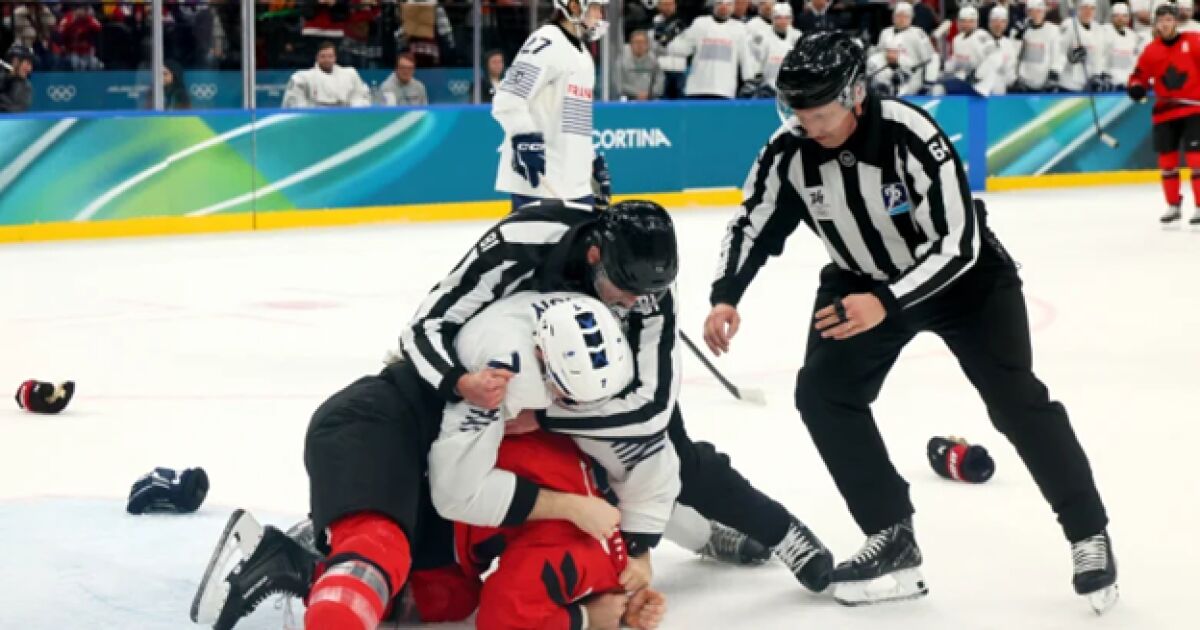 Tom Wilson y Pierre Crinon, a puñetazo limpio en el Canadá-Francia#MilanoCortina2026 pic.twitter.com/dfeJ9o7eEP