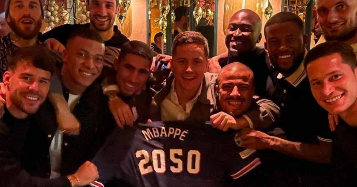Килиан Мбапе навърши 23 години вчера. Отпразнува го със съотборници в заведение, а предвид неясното му бъдеще, те решиха да се пошегуват с него. Или пък може би да го убедят да остане, като му подариха фланелка на ПСЖ с надпис "Мбапе 2050".