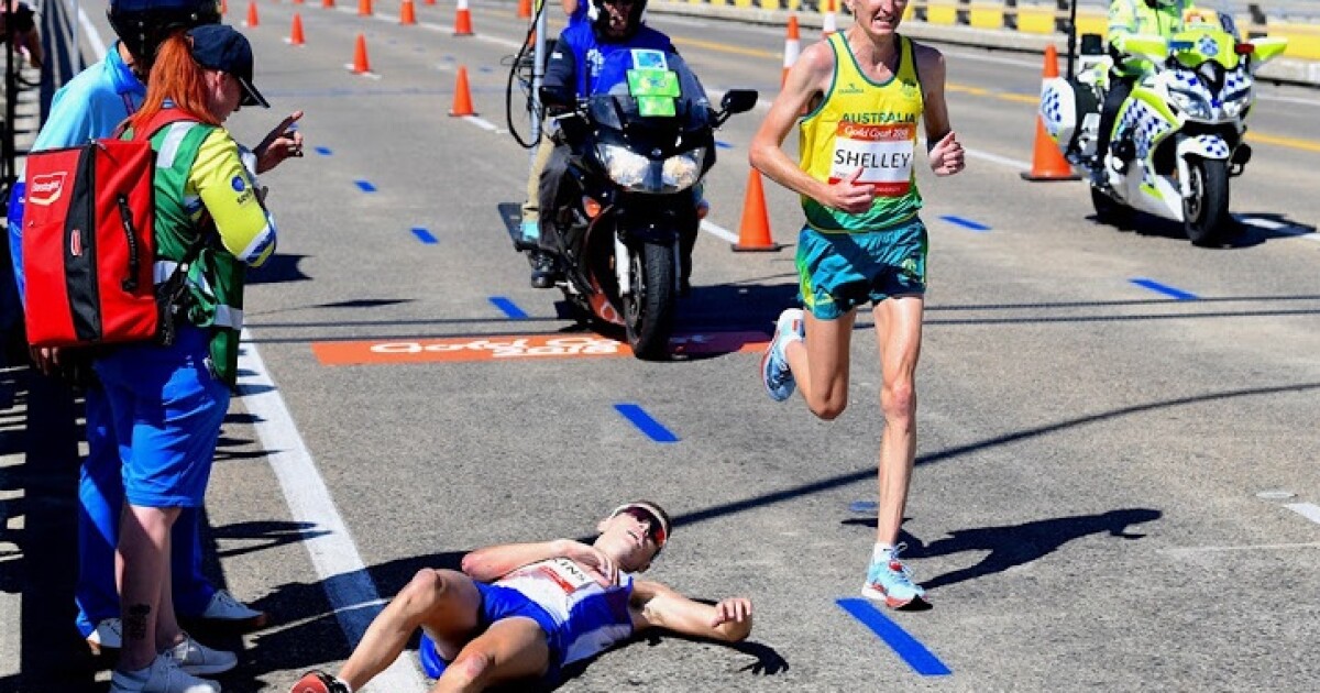 Голям скандал във финалния ден на Игрите на Британската общност. В Голд Коуст шотландецът Калъм Хоукинс водеше убедително в мъжкия маратон, но на 40-ия километър започна да губи баланс и падна на един тротоар, в краката на феновете.